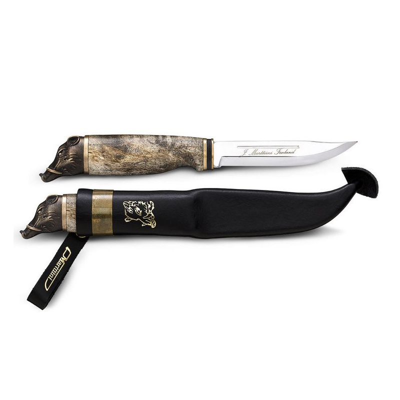 Marttiini Wild Boar spája legendárnu fínsku ostrosť s precíznym dizajnom, ktorému dominuje odlievaná bronzová hlavica v tvare hlavy diviaka. Ideálna voľba pre zberateľov a náročných poľovníkov.